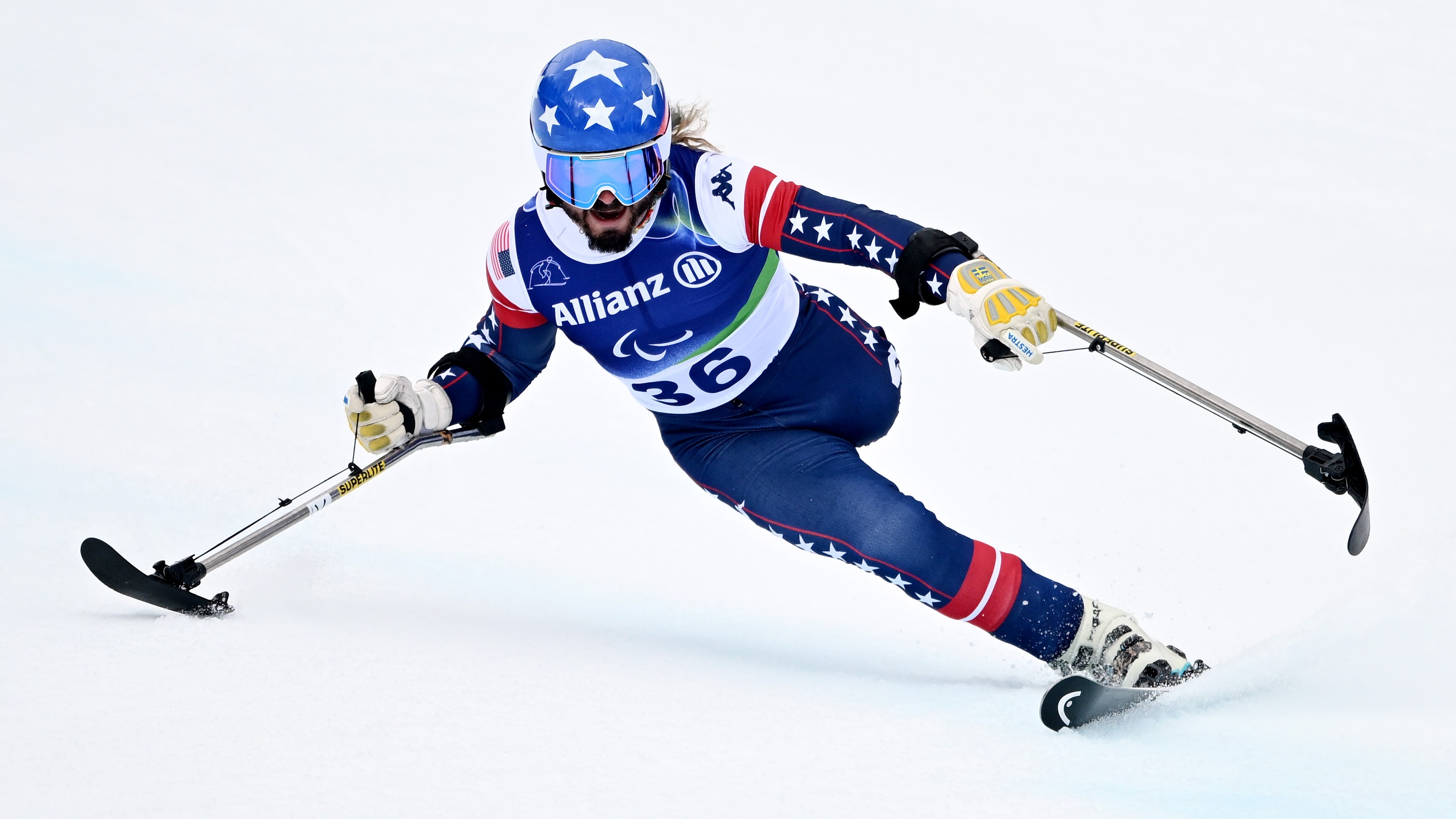 Patrick Halgren of Team USA competes during the para-Alpine skiing men’s giant-slalom standing on Day 7 of the 2026 Winter Paralympic Games, at Tofane Alpine Skiing Centre on March 13, 2026.