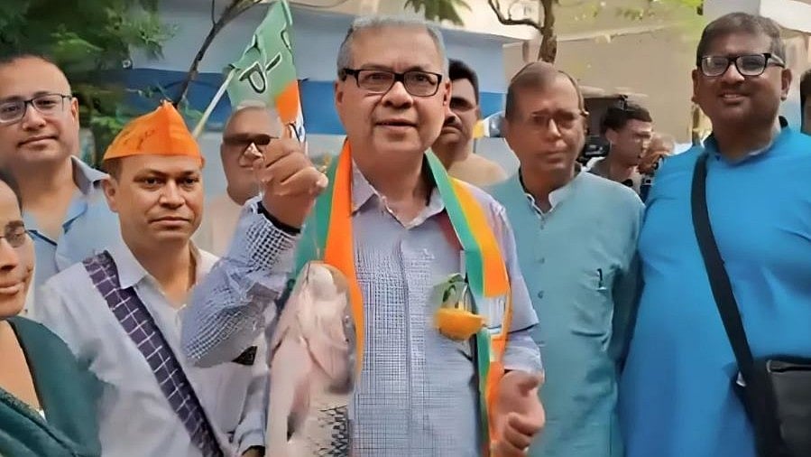 #Watch: #BJP’s candidate from Bidhannagar constituency, Dr Sharadwat Mukherjee campaigning with a fish in hand. pic.twitter.com/p0YuNVgKTx